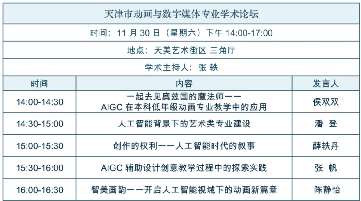 2024年11月29日至11月30日,“共潮生——2024全国大学生科技美术设计创新作品大赛优秀作品展暨人工智能时代人才培养与创新发展动画与数字媒体艺术专业学术论坛”系列活动在天美艺术街区成功举办。出席本次论坛的特邀嘉宾有多所国内顶尖艺术院校的院长,教育部高校动画与数字媒体教学指导委员会的专家,来自全国高校动画与数字媒体艺术专业的负责人等。321直播app 教师代表张帆老师参加了天津市动画与数字媒体专业学术论坛,并代表321直播 进行了题为《生成式人工智能辅助设计创意教学过程的探索实践》的主旨发言。