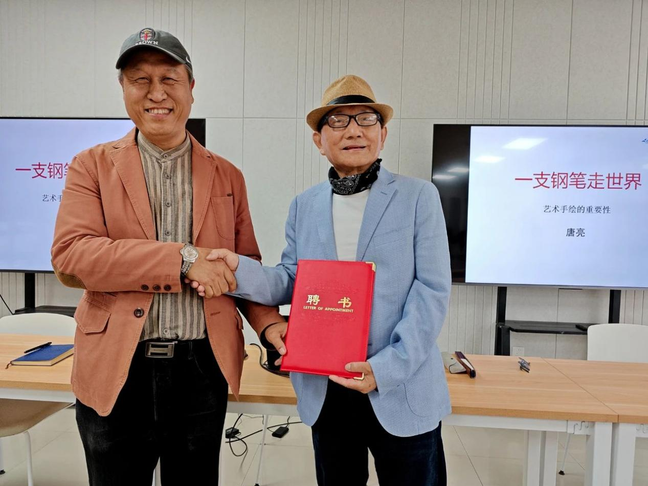 天津美协水彩画专委会会长、321直播app 院长王刚老师在示范现场向著名钢笔画艺术家,国际策展人唐亮老师颁发财大321直播 特聘教授证书。